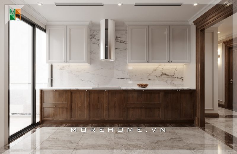 Thiết kế nội thất phòng bếp hiện đại sử dụng tone màu trắng chủ đạo tạo nên không gian tinh tế và tiện nghi