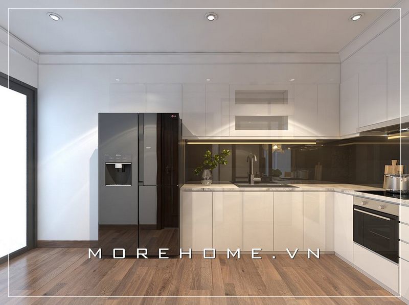 Mẫu thiết kế phòng bếp đặc biệt phù hợp với những căn nhà có diện tích không quá lớn khi bố trí hệ thống tủ bếp acrylic nhiều ngăn sáng tạo