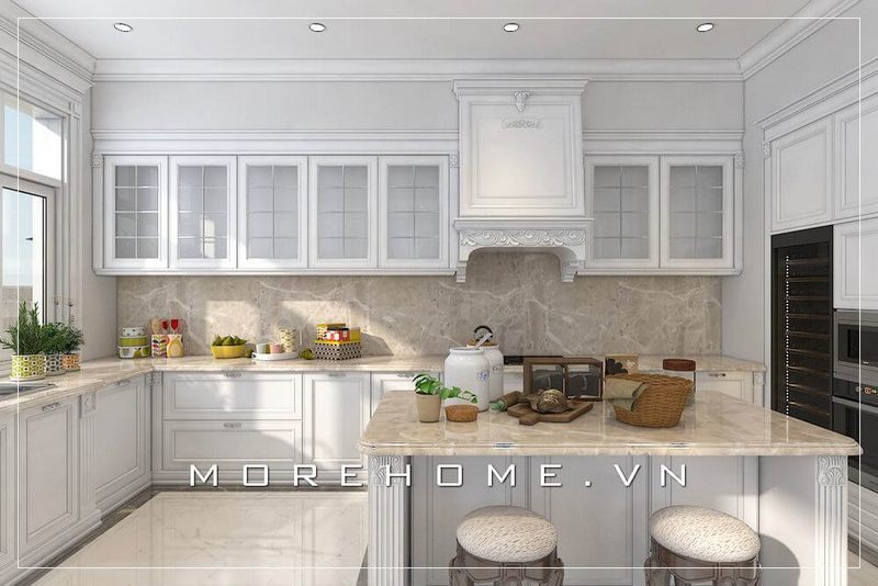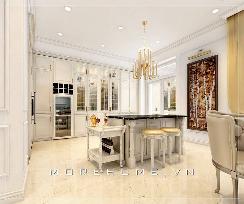 Thiết kế phòng bếp biệt thự tân cổ điển sử dụng nội thất gỗ tự nhiên tone màu trắng đem lại cảm giác tinh tế, hiện đại và sang trọng