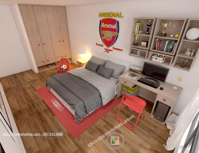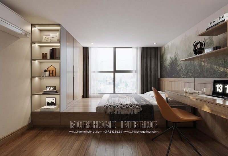 Không để cho mảng tường đầu giường có sự trống trải KTS đã thiết kế kệ trang trí, tủ quần áo gỗ công nghiệp áo ngay mảng tường này tận dụng không gian làm căn phòng thêm rộng rãi