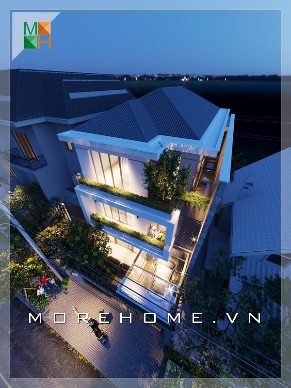 Mẫu thiết kế nhà phố ba tầng cao cấp sang trọng sử dụng sắc trắng trẻ trung với phần sân vườn rộng rãi, thoáng đãng.