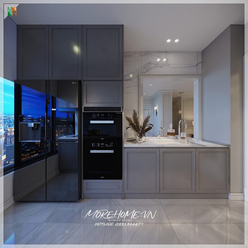 Thiết kế nội thất phòng bếp chung cư với tone trắng tinh khôi đóng vai trò chủ đạo đậm chất tân cổ điển lại góp phần tạo hiệu ứng cơi nới cho không gian.