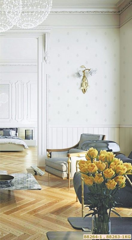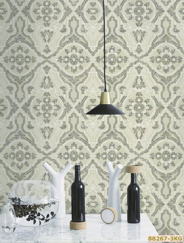 Giấy dán tường 88267-1 phù hợp cho trang trí những không gian biệt thự sang trọng kết hợp cùng phào chỉ nhựa để làm nổi bật thêm họa tiết hoa văn của giấy