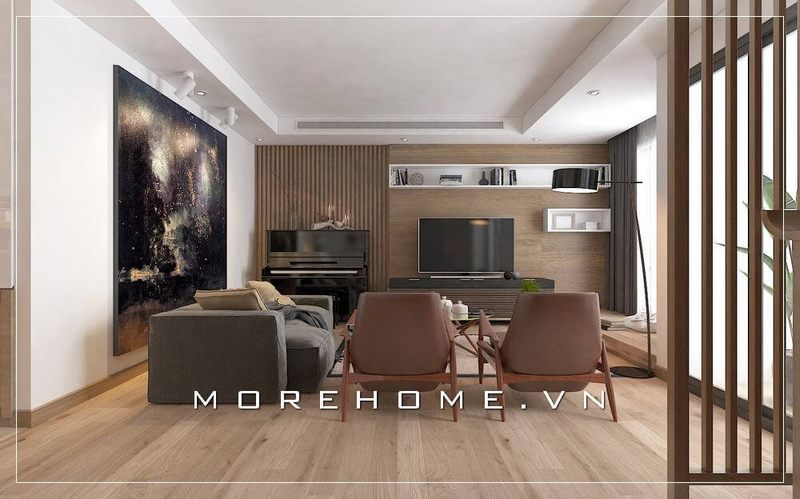Bố trí phòng khách với nội thất gỗ hiện đại tone màu xám tạo cảm giác ấm cúng và thân thiện cho nhà chung cư
