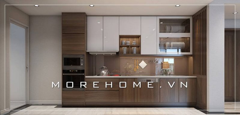 Thiết kế phòng bếp chung cư theo phong cách hiện đại, nội thất gỗ công nghiệp đơn giản và tiện nghi cho nhà chung cư