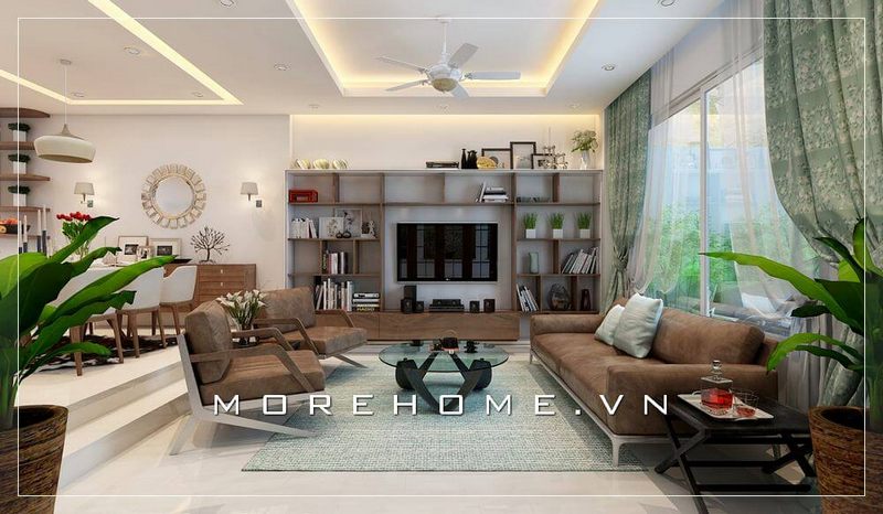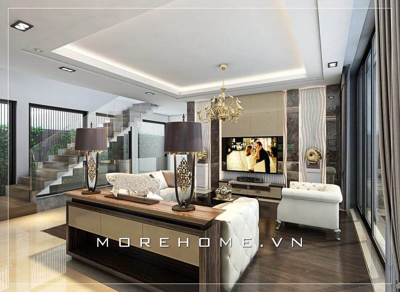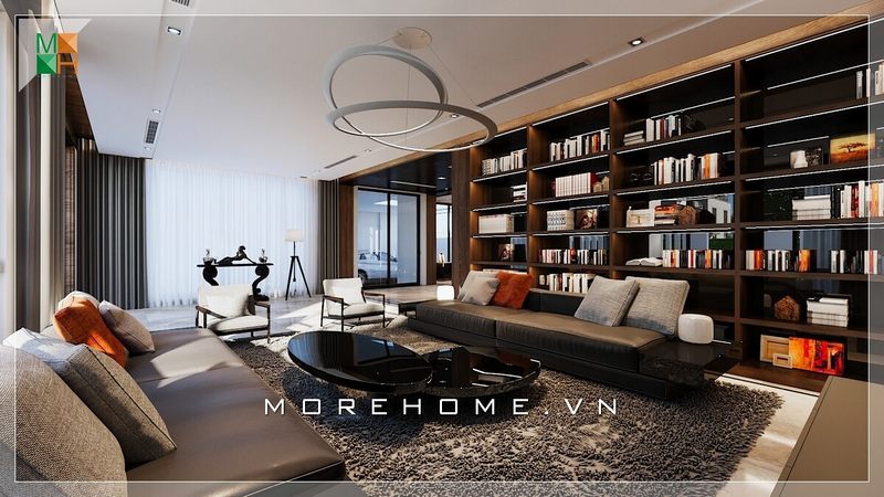 Vẻ đẹp hiện đại, trẻ trung của phòng khách biệt thự, nhà phố với tâm điểm là bộ sofa văng da ấn tượng và nội thất gỗ óc chó cao cấp thu hút mọi ánh nhìn.