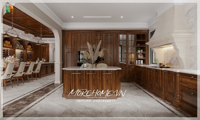 Thiết kế phòng bếp tân cổ điển liền phòng ăn với diện tích lớn cùng nội thất gỗ óc chó đồng bộ mang lại sự sang trọng cao cấp