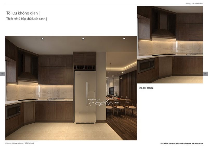Phong cách hiện đại trong thiết kế phòng bếp phù hợp với cả biệt thự, nhà phố hay chung cư vì sự thoáng đãng trẻ trung nó mang lại. Chất liệu gỗ óc chó thể hiện đẳng cấp của người chủ sở hữu