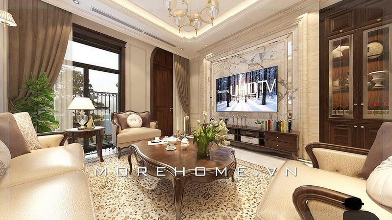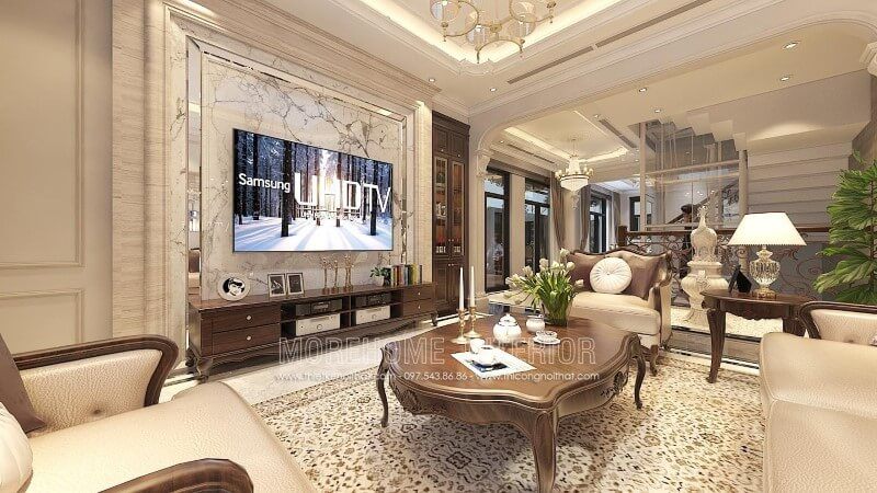 Thiết kế phòng khách theo phong cách tân cổ điển với nội thất gỗ óc chó tự nhiên bọc bởi nỉ Bỉ cao cấp.