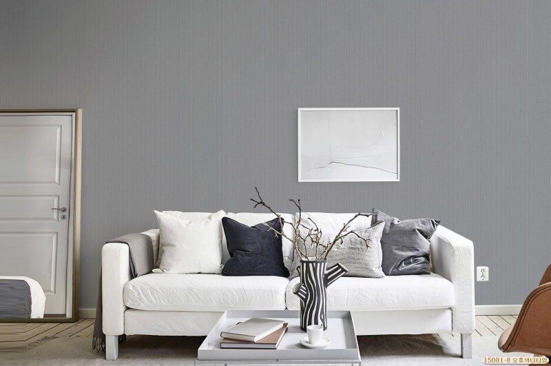 Giấy dán tường có màu ghi trung tính giúp tạo nên không gian phòng khách trẻ trung và lịch sự.