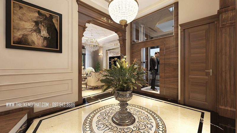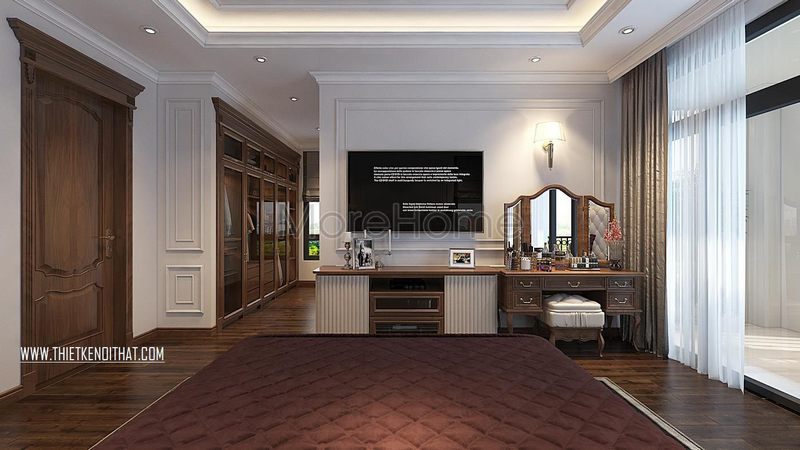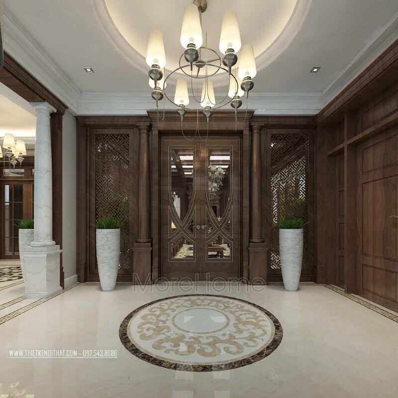 Mẫu cửa gỗ màu nâu phong cách tân cổ điển sang trọng đã tạo ra ấn tượng sâu sắc và dễ dàng kết hợp với nội thất khác trong căn phòng.