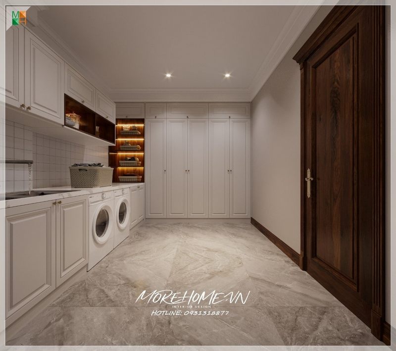 Phòng giặt được thiết kế với màu trắng tươi sáng, có vẻ đơn giản với một tủ có nhiều tầng và ngăn để chứa các loại đồ giặt ủi phổ biến.